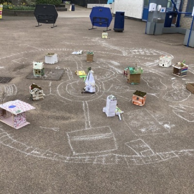 Once we had created our individual buildings we compiled them together to create a Sustainable City. Together we discussed the location for the different buildings, how they would be placed using chalk to create other City features we were keen to have, such as cycling paths, tramlines, and plenty of green spaces.